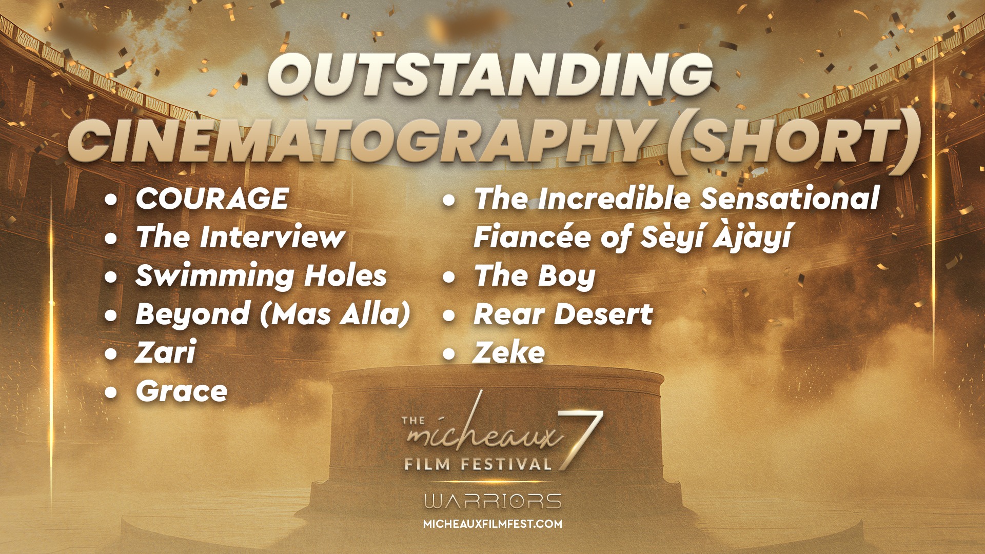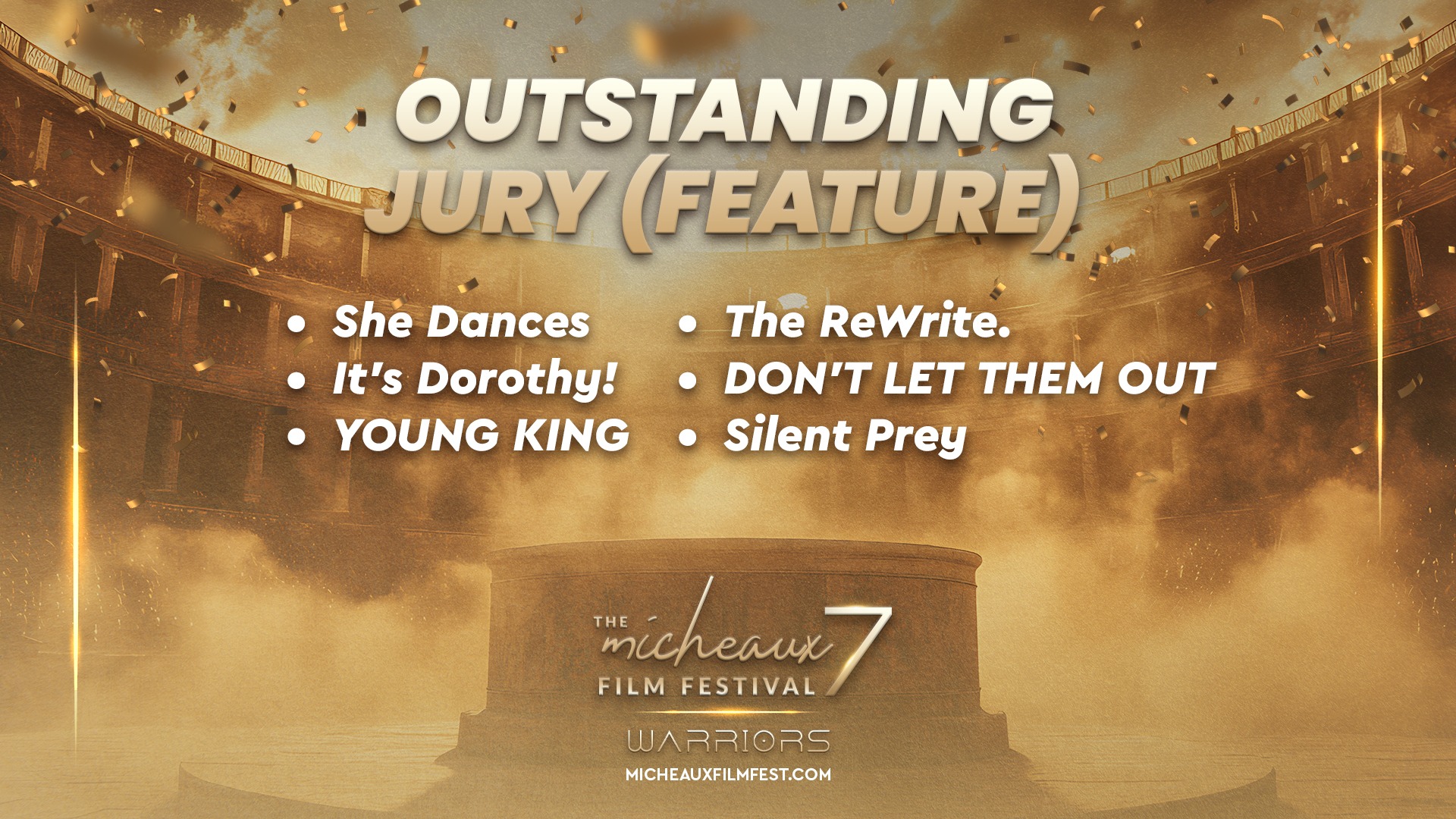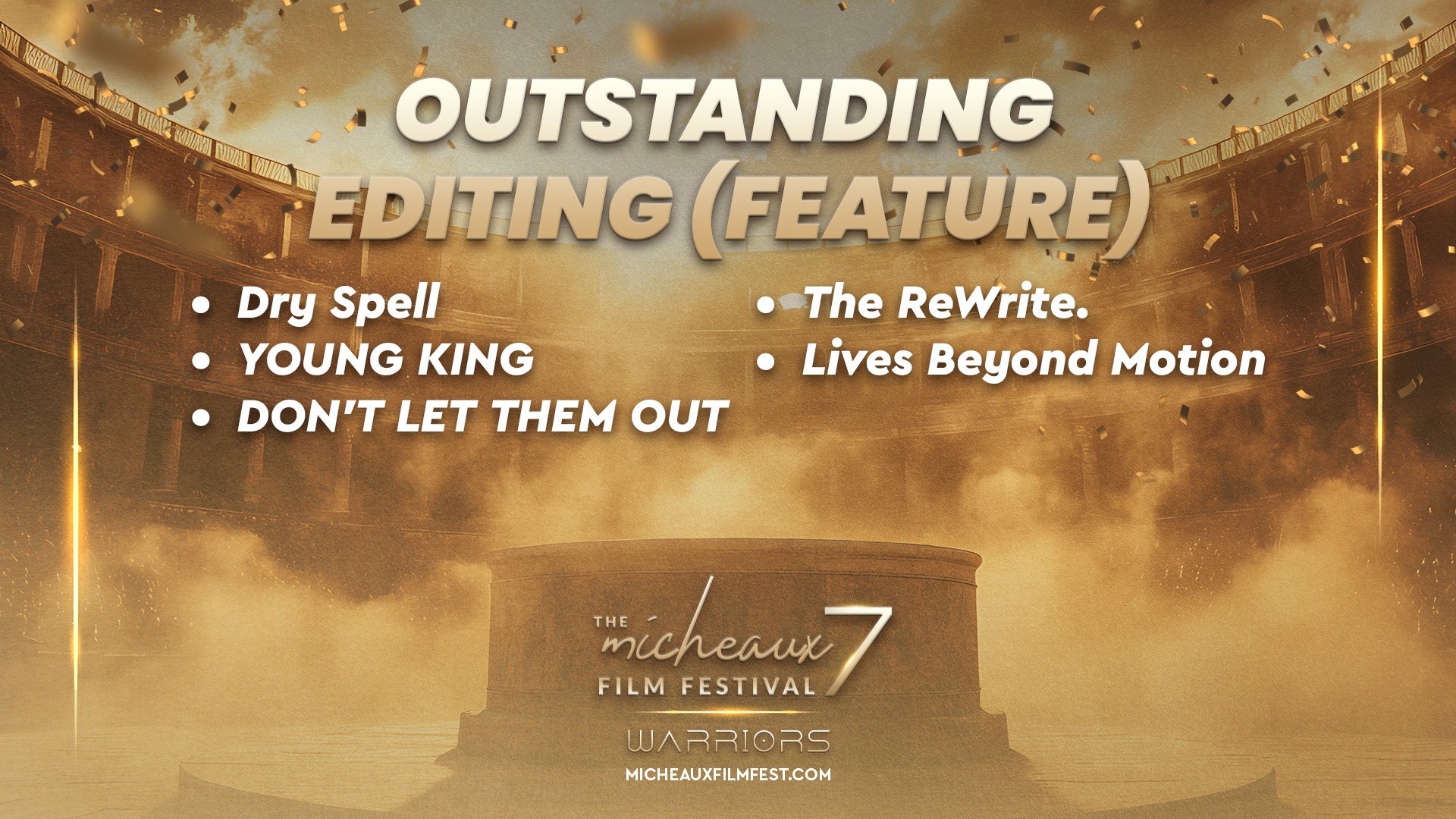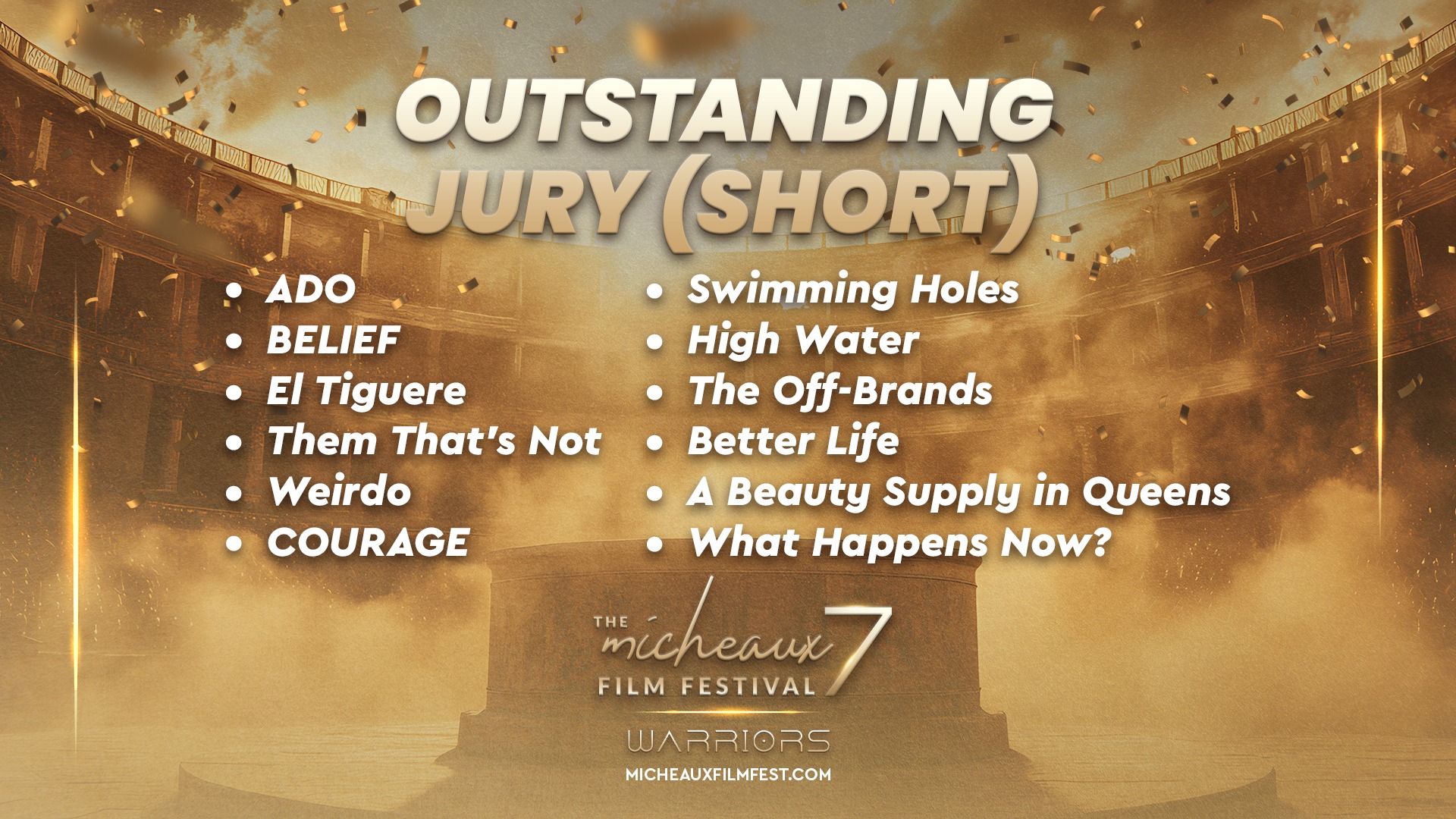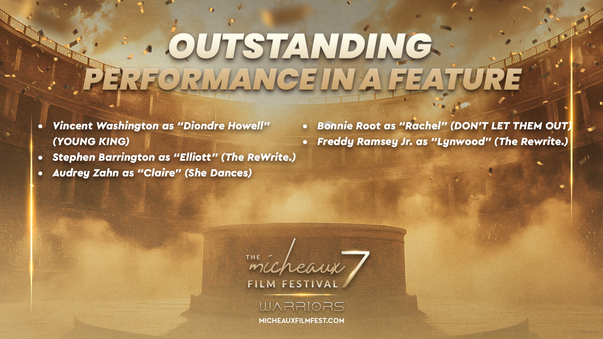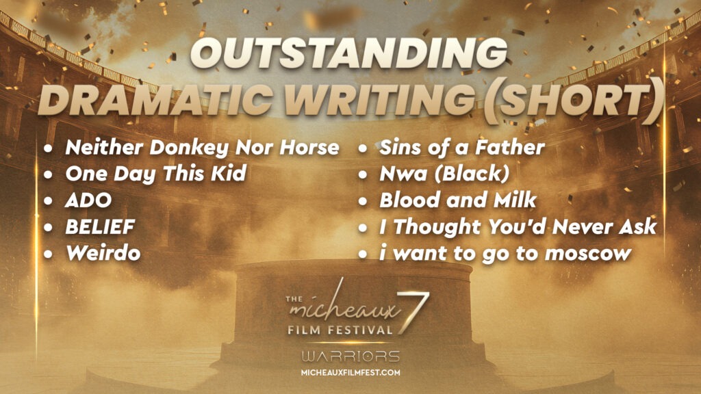 Award 2025 2025 WINNERS 2025 HONOREES 2025 Winners Wednesdays With Gramps | I Know Him So Well Courage Young King Beyond (Mas Alla) Better Life BeforeHand Ivonnah Erskine as “Sara” (Love is Blind) I Thought You’d Never Ask I Hate My Love Life Remember She Dances It’s Dorothy! 20 Summers: Rebuilding the Rhythm of New Orleans Ado Jimmy Jean-Louis as “Mr. Godwin” (Sins of a Father) Lives Beyond Motion The Off-Brands The Ride Missing Rhythms Neither Donkey Nor Horse The ReWrite Belief The Village It Took I’m In Love Audrey Zahn as “Claire” (She Dances) Freddy Ramsey Jr. as “Lynwood” (The Rewrite) The Lord of all Future Space and Time Legend Has It: The Remarkable Rise of Stephen McCain #1 BAD DAD The ReWrite